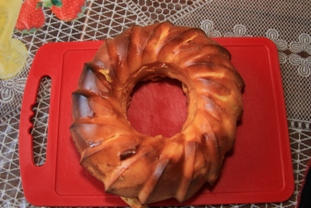 А вот и шарлотка готовая, правда выпекали ее в форме для кекса, т.к. круглая форма буквально на днях разбилась у нас.