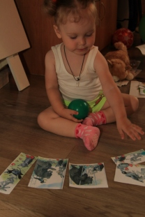 Затем я в очередной раз рассказываю сказку, и прошу Алену подбирать картинки по ходу сюжета. Аленка не совсем поняла, что от нее требуется, поэтому приходилось описывать саму картинку, которую необходимо найти.