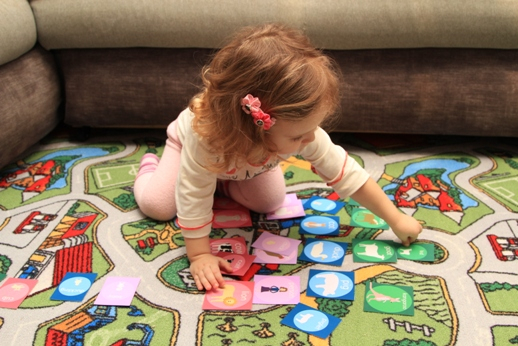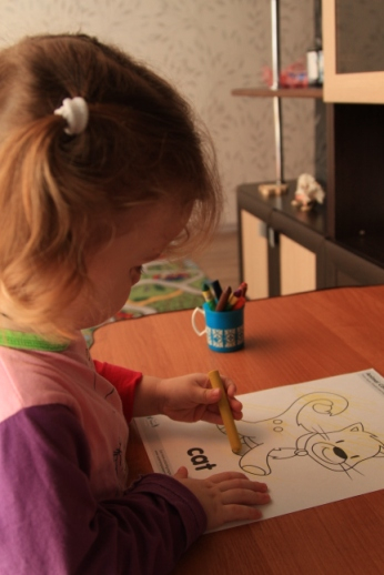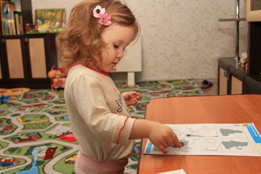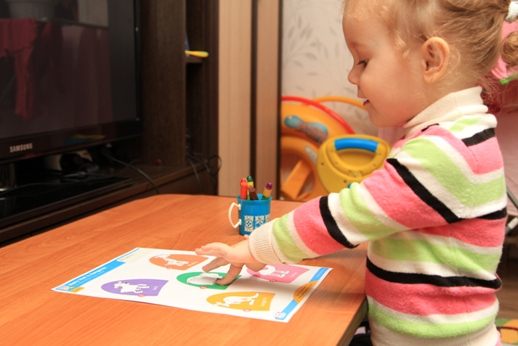 И нашли каждому силуэту хозяина. Я специально путала ребенка, показывая на собаку, например, спрашивала на английском "это кошка?" Алена говорила "нет" и хватала верное изображение и приклеивала его.