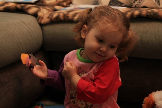 А вот под песню I have a pet Алена сразу начала все делать, стоило один раз показать. Всех упоминаемых в песне животных она знает, берет животное, изображает и кладет на место по мере звучания песни.