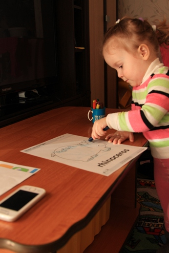Итак, первая песня Mary had a little lamb. Сначала я одна изображала упоминаемых в песне животных, потом и Алена присоединилась, особенно ей понравилось прятаться от острого рога носорога. Затем раскрасили носорога, цвета все Алена выбирает сама.
