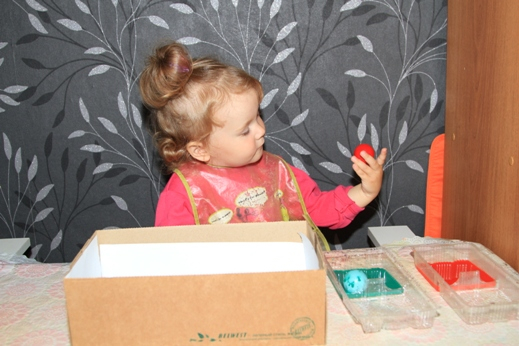 Расстилали мы на полу обои и закрепляли их скотчем. Наше творчество началось с машины, оставляющей зеленые следы. Темные цвета дочку привлекают больше всего. Сначала ими вдоволь рисует, потом уже к остальных переходит.