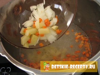 3. Блендерим рыбу с отварными овощами, добавляя бульон в количестве нужной вам консистенции супа.
