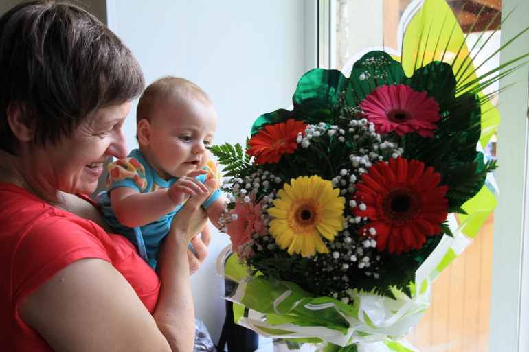 С бабушкой облюбовала цветочки) Надо сказать, что из этого букета дочь сразу выдрала бантик - порядок для прабабушки в букете навела)))