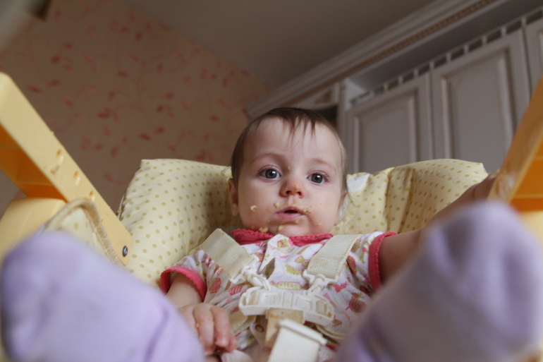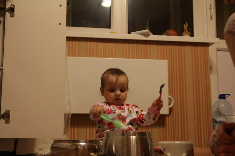 Марта любит все подвижное - много, много действий и маму рядом))) Поет в караоке))) Стучит по кастрюлям)) Играет в мяч с котом. Любит листать книжки и рассматривать картинки, но когда начинаю читать - уползает))) Учимся кушать ложкой)