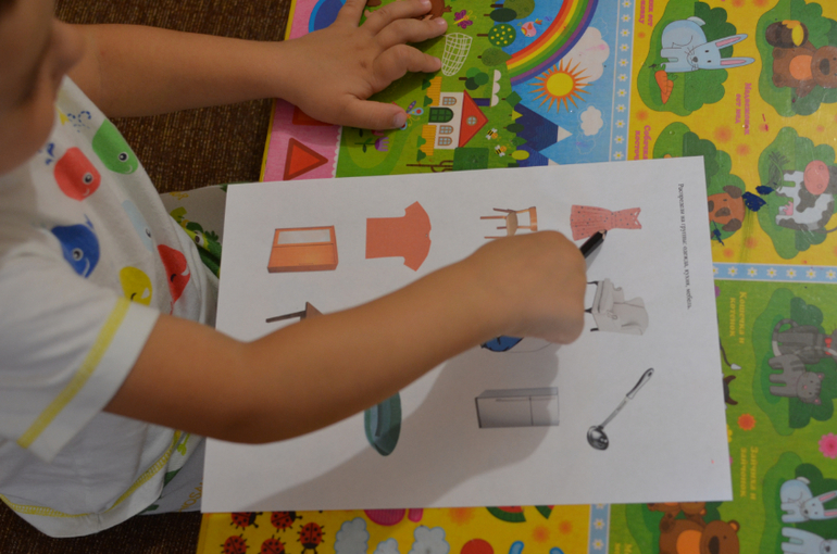 На след.день я дала ему задание, обвести предметы по группам:мебель, кухня и одежда.