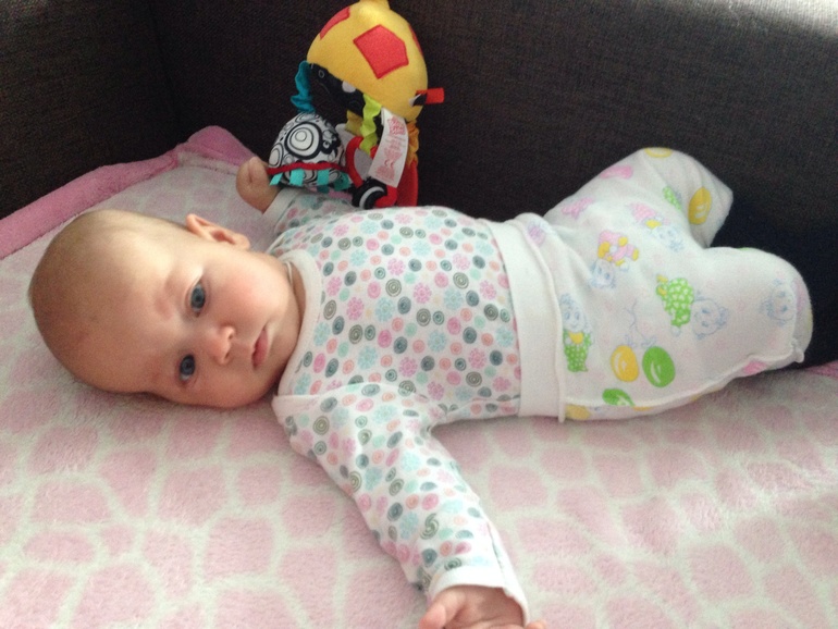 Хорошо держит голову в любом положении, переворачиваемся только на бочок, хотя один раз перевернулась на животик это было 15 сентября. Любит играть с игрухами, сама берет их, только вот, если держит в руке сразу тянет в рот. Конечно же узнает всех родных. Во общем все мы делаем по возрасту.