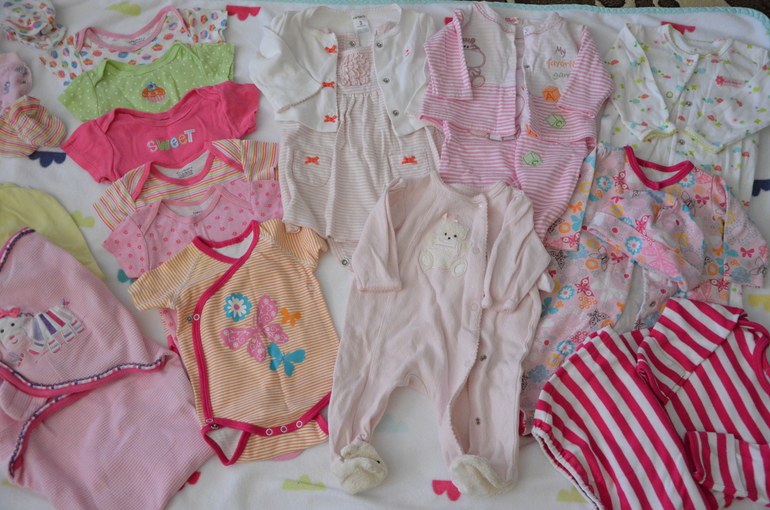 Одежда пакетом. Все в идеальном состоянии, пятен, дырочек и прочего нет. Размер в основном 0-3 мес. Кое-что маркируется 3 мес. Один слип на 6 мес. Практически все заказывала из Америки (Carters, Zuffano, Gerber, Summer Infant), пара кофт отечественных (на фото их нет).