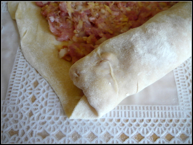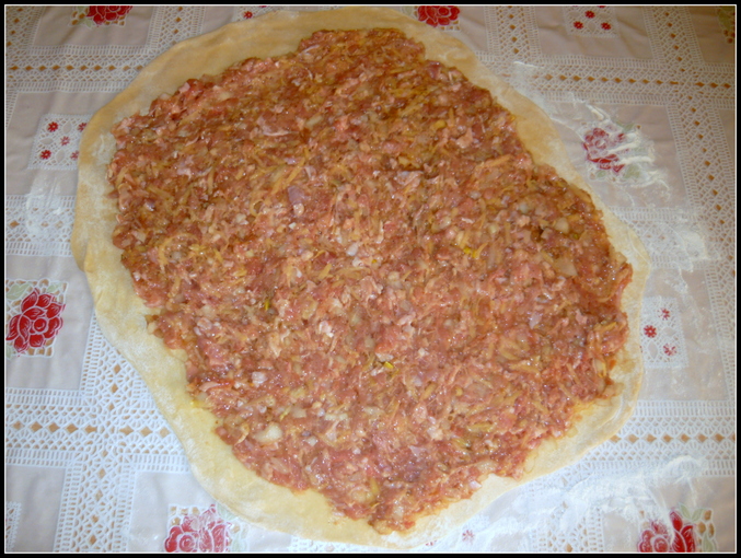 3. По истечении 30 минут раскатываем тоненько тесто и выкладываем на него нашу начинку, отступая от краев.