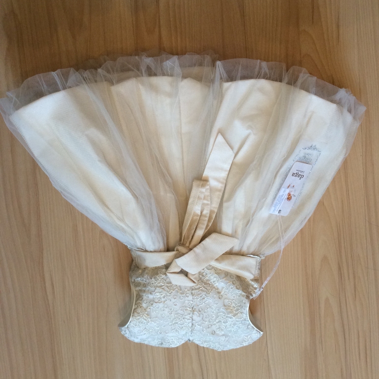 Очень красивое нарядное платье, верх выполнен из нежного вязанного кружева, юбка балончиком, пышная , внутри хлопковый подклад, на поясе нежные цветы - брошь дополняющие образ