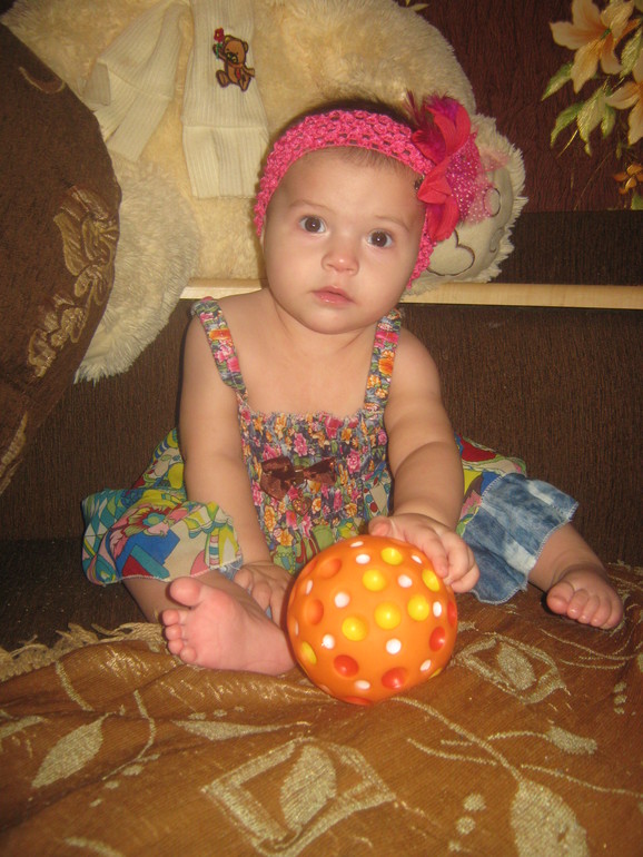 3. Ксюшка.Она вообще меня радует . В 6 месяцев она поползла, в это время научилась сидеть на коленочках. В 7 месяцев научилась вставать.. у опоры и сидеть на попе. А в прошлом месяце моя малявочка научилась ходить. Даже бегать, баловаться выключателями, стоять как страус))). Много лепечет очень много на своём, птичьем.