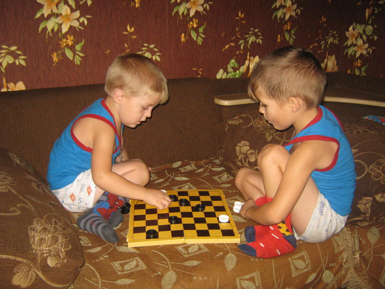 научились играть в шашки! Правила поняли и запомнили оба. Игра больше понравилась Мише. Он уже всех ими измучил). Не давно оставляла его с бабушкой на 3 часа, так они всё это время только в шашки и играли)). Сейчас хитрит с Кириллом - поддаётся ему в первый кон (что бы Кирилл сразу не бросил), а потом нещадно его обыгрывает. ну что ж, старший брат