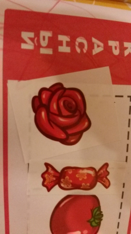 Нужно по цветам рассортировать предметы. Начали с красного. Кузя показывает на розу. Уточняю, что это. Ответ просто сразил: капуста!