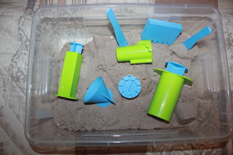 Кинетический песок прикупила-добавку 2,5 кг к имеющемуся кг. Итого 3,5. Играем- зависаем всей семьёй! Прячем зверей, пишем на песке, строим замки, фигуры, режем ножом и делаем пирожные, возим-грузим его. Миллион игр!
