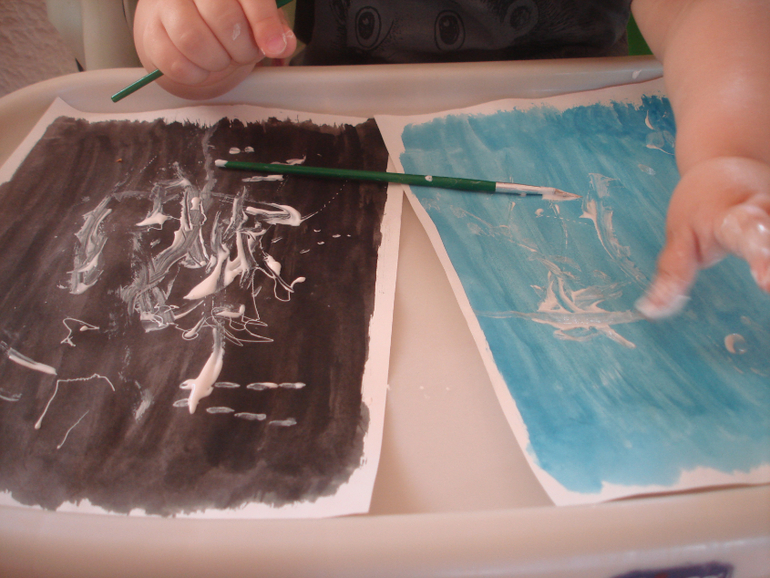 Начали занятие с того,что за неимением черной фактурной бумаги сделали свою. а потом голубую. И обыграли разными контрастами