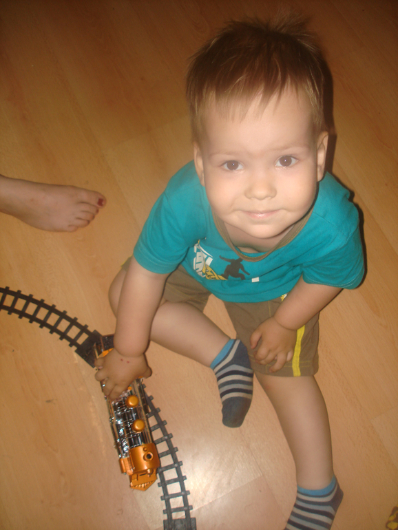 Сестра Аня подарила железную дорогу. Сам поезд отличный,вагоны у нас теперь и спят.и купаются с Максимом,а вот рельсы...не хватило,как бы это сказать,длины окружности. Не входит состав в поворот,обидно. Но играем на полу и не придаем значения.