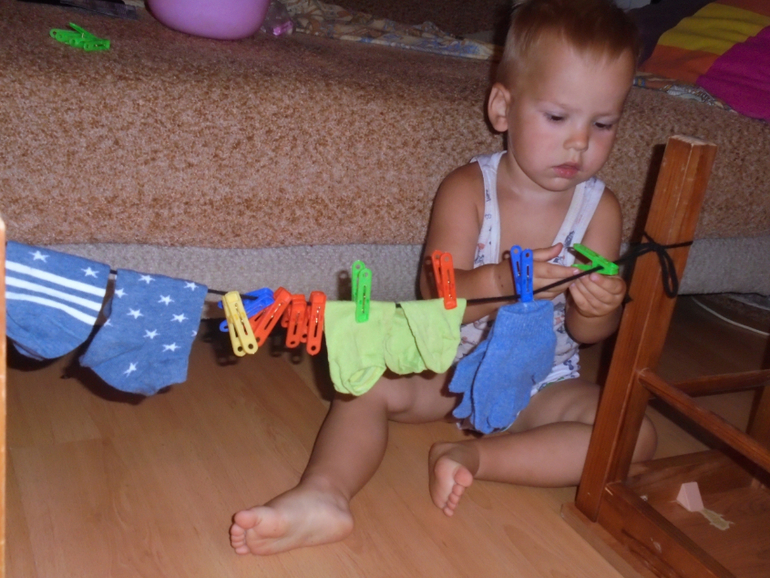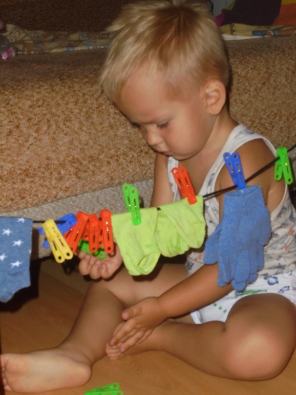 Есть передача "Маленький Леонардо" в которой О.Н. Теплякова предлагает вариант игры с носочками. Играли примерно час. Потом эта конструкция стала паровозиком,катали в ней игрушки)))