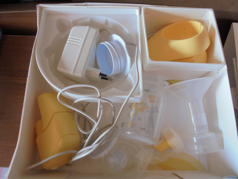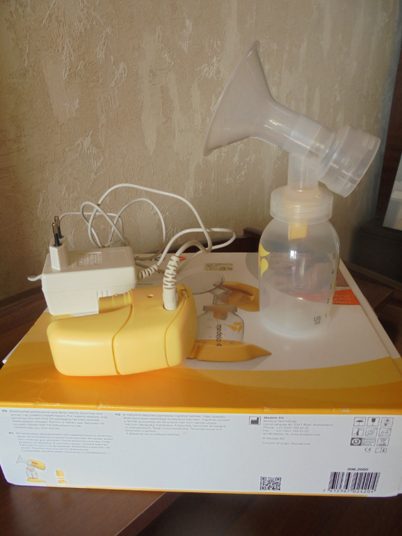 Молокоотсос Медела с имитацией естественного сосания груди ребенком. Меня в свое время очень выручил,первые несколько дней после начала лактации ребенок не справлялся сам. Полный комплект насадок,подставка. Живые фото
