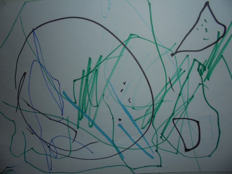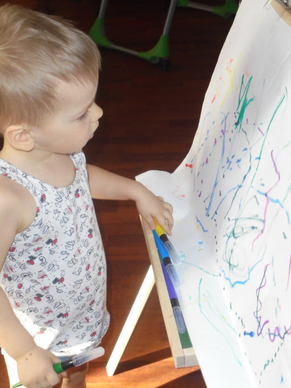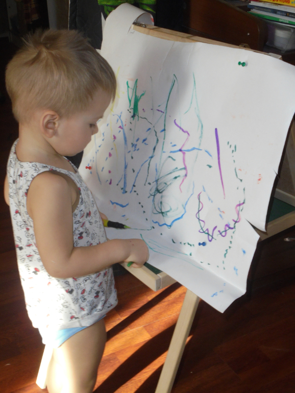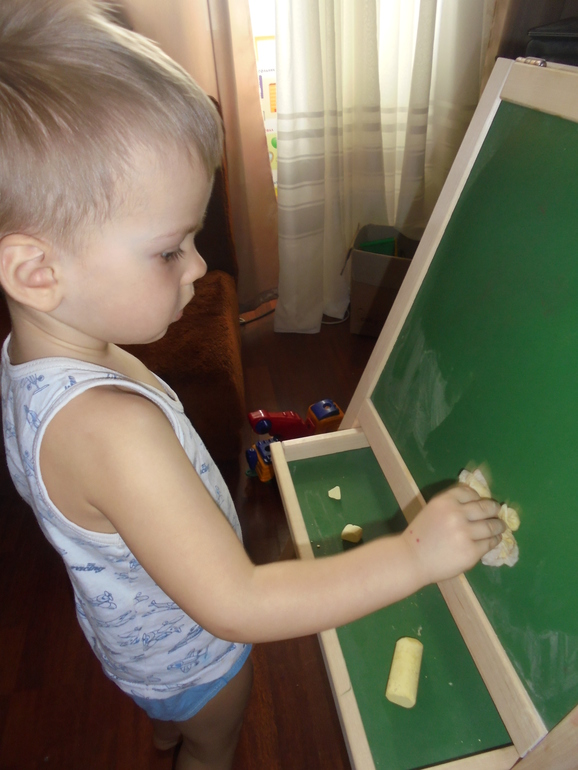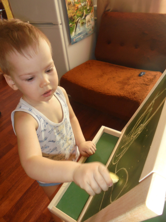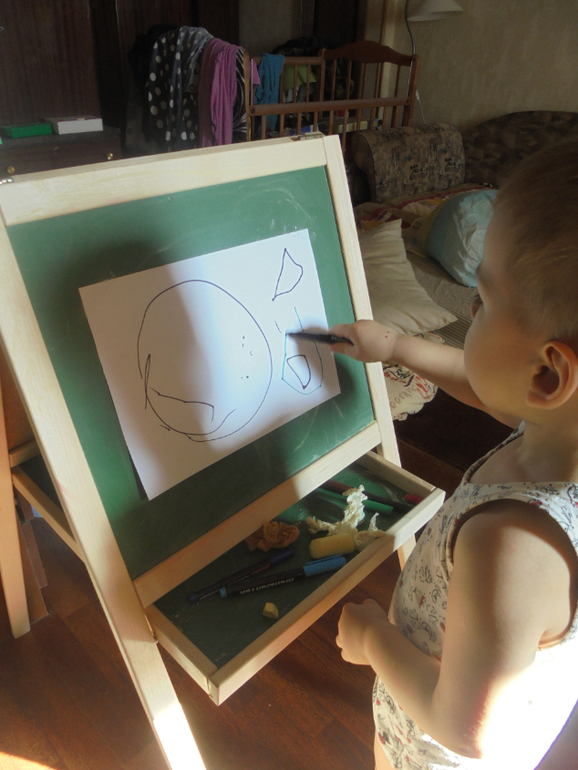 Еще достали мольберт ,рисовали на нем мелом,мокрой тряпочкой,потом на приколотых листах бумаги А4 и А3. По совету Елены поставила точки и просила соединять линии. Будем тренироваться