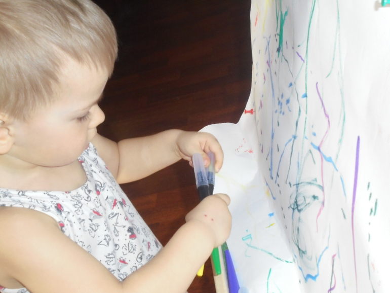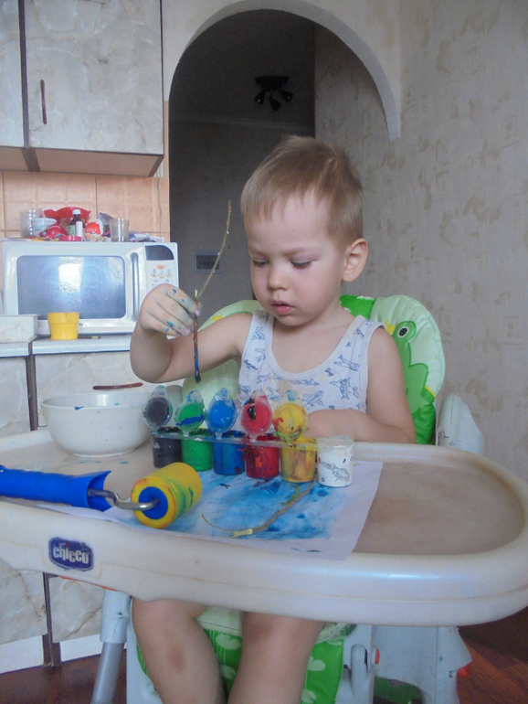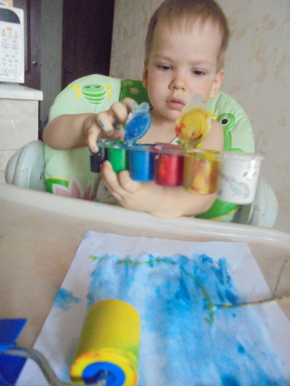 Елена говорила,что ребенку важно попробовать разные материалы,фактуры,способы рисования. Чтобы определиться и начать рисовать в будущем. Чем раньше-тем лучше. В проекте Ирины Волковой на бб Художка онлайн мы уже второй год развиваем это умение. Например,валик вместо кисти (палочка понравилась больше в этот раз)