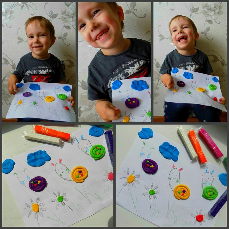 Вот и сегодня его ждала необычная, но безумно интересная аппликация из пластилина. Сделали настоящую семью ярких весёлых улиток!