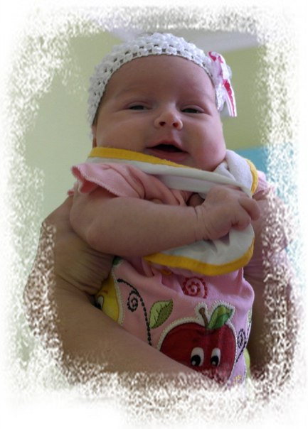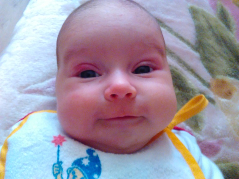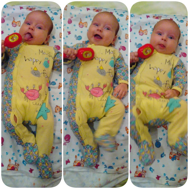 Там я еще малышка. А сейчас я уже совсем большая. И много всего умею. Умею держать голову, поворачиваться на бочок, держать игрушки, петь песенки, разговаривать. Еще папа научил меня пускать пузыри. Это очень интересно и весело. У меня даже получается лучше, чем у него))) А сегодня я научилась управлять своей правой ручкой. Целый день играла со своим кулачком. Как это здорово. Мама решила мне дать игрушку. Я не растерялась и сразу на вкус ее попробовала. Это что то новое. Но всё равно вкусней маминого молочка ничего нет. Иногда мама мне даёт какую то резиновую соску. Так я её сразу выплевываю. Не понимаю, зачем она мне? Там же и молочка нет и не вкусная она... А еще я обожаю улыбаться. Иногда даже смеюсь)))