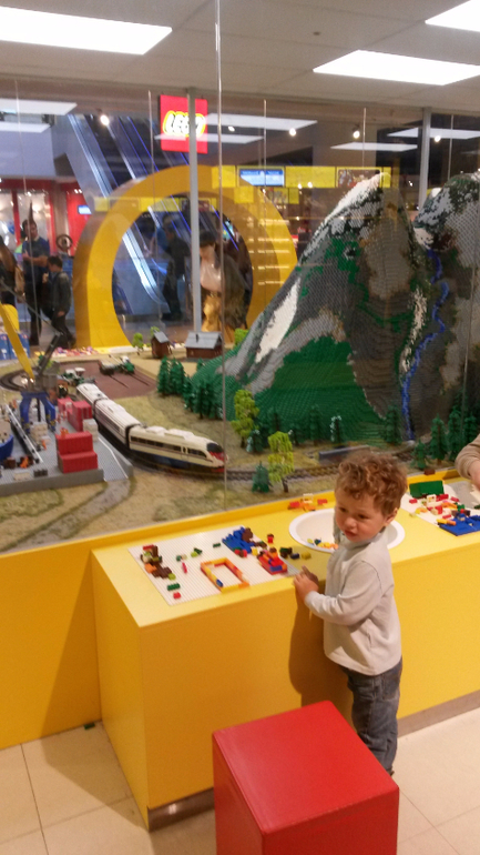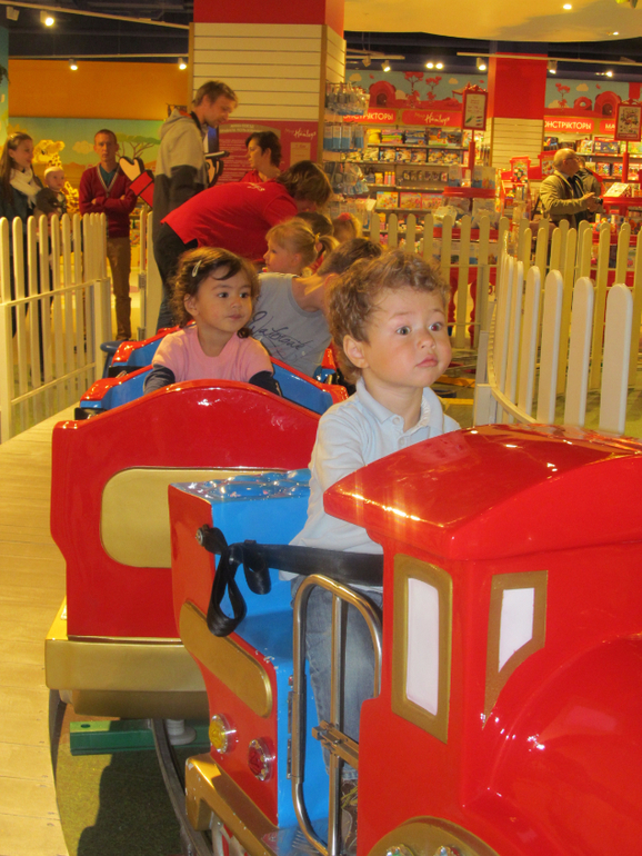 Начали мы с аттракционов.. Макар ломанулся на паровозик, бежал впереди планеты всей, залез в первый вагон, крутил руль и всячески показывал свою готовность ехать на этом паровозе хоть на луну.. но, после первого же круга, начал истошно вопить, заливаться слезами и пытаться выбраться из паровоза, благо был пристегнут крепко . ну и все.. на этом наши катания на аттракционах были закончены. А я так хотела с ним на карусели с лошадками прокатиться.. но нет, ни в какую. Потом мы пошли в зону Лего - это конечно восторг!!! Макара было не утащить оттуда!! Какие там карусели!! )) эти стенды с городами построенными из лего, да еще и с пультом управления некоторыми частями!!! Он нажимал, смотрел, бегал вокруг, восхищался и вообще было готов там остаться жить )) потом начал собирать что то из мелких деталек лего… кстати, вот большие кубики дупло его особо не заинтересовали. А от мелких было не оттащить… и я вот теперь в раздумье… то что на ДР он получит Лего - это однозначно. Но я не знаю дупло покупать или уже с мелкими деталями, но самые простые…