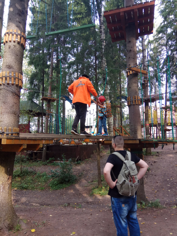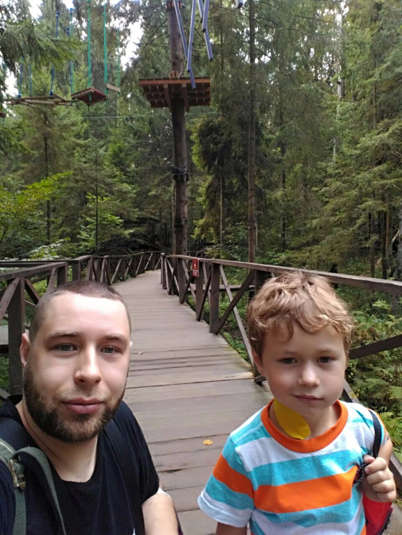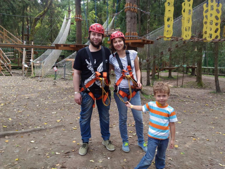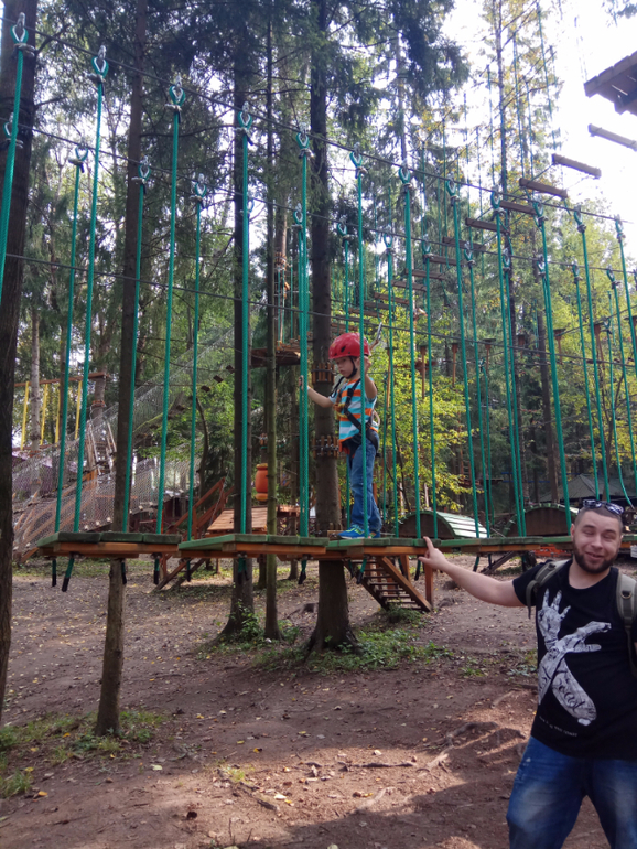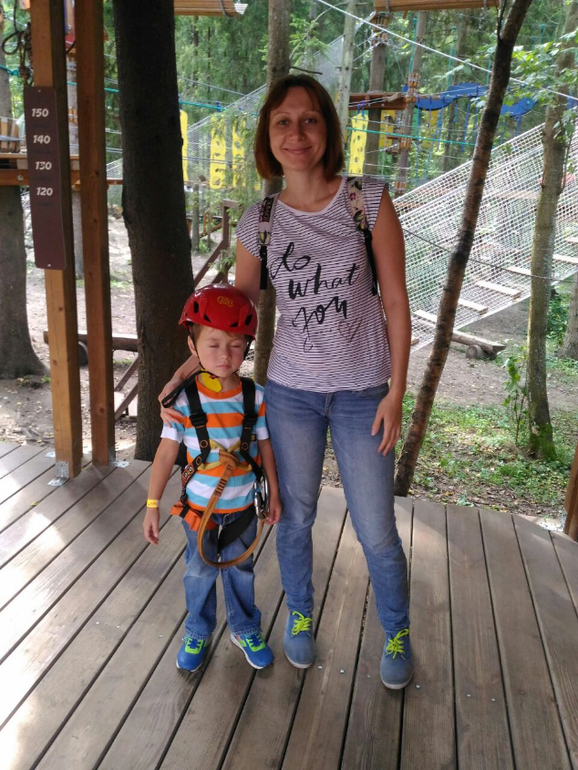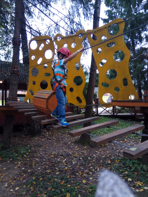 Пробыли мы там часов 5-6. Устали нереально, у меня болело все , включая глаза )) но там оч круто, советую! Безлимит стоит брать только если ехать на весь день с едой (там есть беседки и мангалы), ну и желательно если есть мало-мальская физ подготовка, или если хочешь полетать на зип-лайне не один раз). Еще там есть скалодром, тир, пейнт-бол, зоодвор, батуты, еще одна детская трасса, обнесенная сеткой (Макару там наверное больше бы понравилось, но она сохла после покраски). Все по отдельной цене.