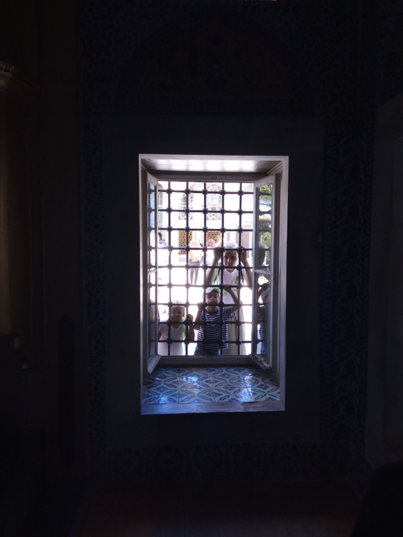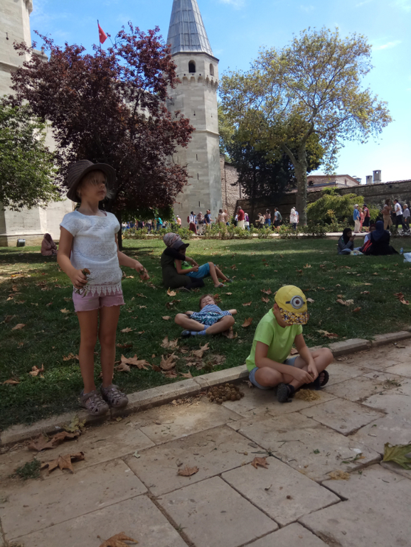 Дети начали ныть почти сразу , было оочень много народу, жарко и насладиться Топкапы мы не смогли ...в сокровищницу со знаменитым кинжалом, драгоценностями и зубами-волосами-отпечатками ног пророка Мухаммеда была тааааакая очередь, что мы даже не сунулись ...вообще конечно, я обычно подготавливаюсь к приезду в горрд, читаю путеводители и тд, но не в этот раз ...как то понадеялась на Таню с Ильёй, которые там уже были . В результате мы ничо особо не узнали про Топкапы, кроме инфы, которая была на табличках ) в общем в гарем мы ходили уже по очереди, кто то сидел с детьми на травке , кто то окультуривался )) но мне опять "повезло", половина гарема была закрыта на реконструкцию(( Топкапы конечно очень красивый - восточной , шикарной, затейливой красотой, росписями, позолотой, израсцами, коврами, креслами , размером с огромную кровать и тд . Там хорошо бы погулять полдня, послушать неспеша аудиогид , посидеть на террасах с видом на золотой рог, посидеть на травке ( лежать нельзя, а сидеть - пожалуйста)) ) и попытаться представить, как тут жили султан и ещё 4000 человек ...