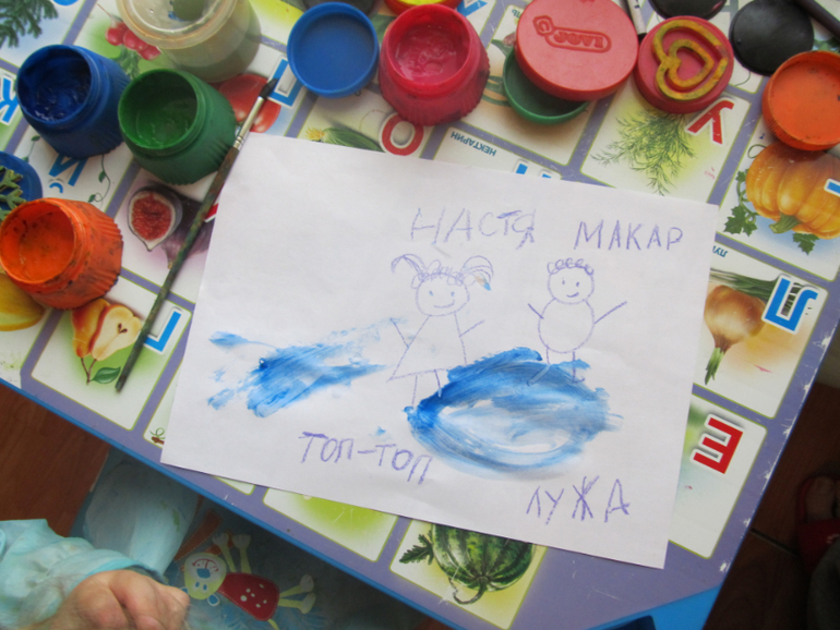 - ба-ба (лужи, вода) . топ-топ (бегали по лужам) . БАМ (упали в лужу)