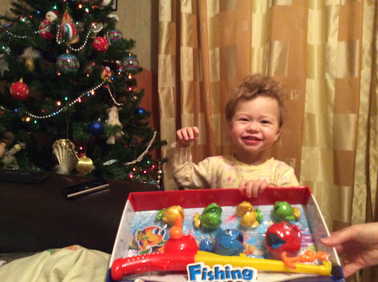 Кстати о подарках… было забавно ) подарков было много, так как МОРОЗО повстречался со всеми многочисленными членами нашей семьи и 1 января под елкой его ждал не один сверток. около 8 утра, несмотря на умоляющие просьбы мамы и папы поспать еще хотя бы полчасика, Макар уверенной походкой с громким лозуногом ГОРИ ломанулся под елку - нашел там свертки с рыбами (чуйка у него на них что ли