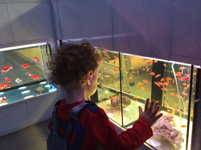 Под эту рыбоманию в декабре мы съездили в океанариум на Чистых прудах. Небольшой, но для детей самое то. Макар был в восторге, носился от аквариума к аквариуму, всех разглядывал, некоторых даже узнал