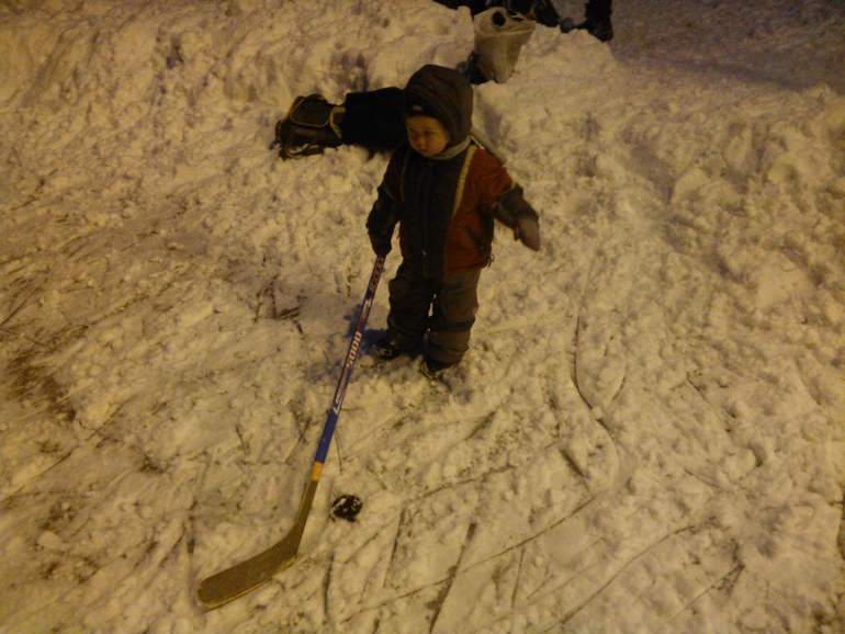 на коньки еще не встал, но клюшку подержал )) привыкает )) :