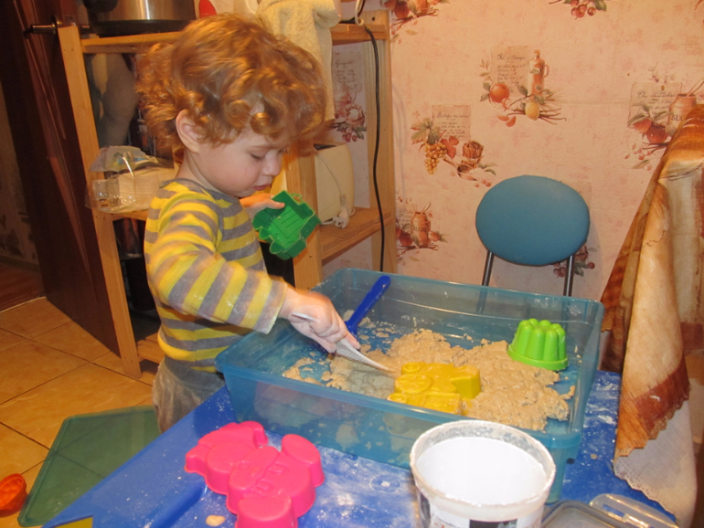 . Но тут звезды сошлись, и сначала нам рассказали, про самодельный а-ля кинетический песок , а потом мы в гостях настоящим поиграли (кстати, говоря мы, я имела в виду именно нас с Макаром, а не его во множественном числе, по дурацкой мамской привычке
