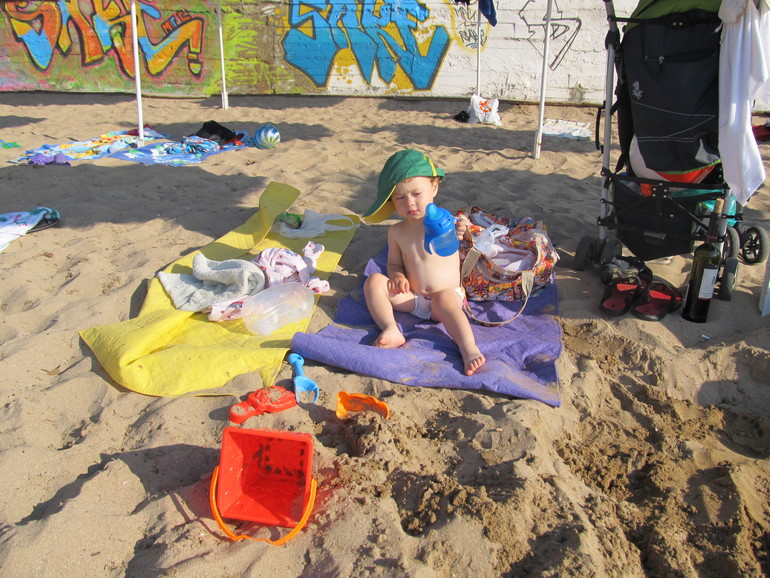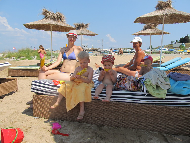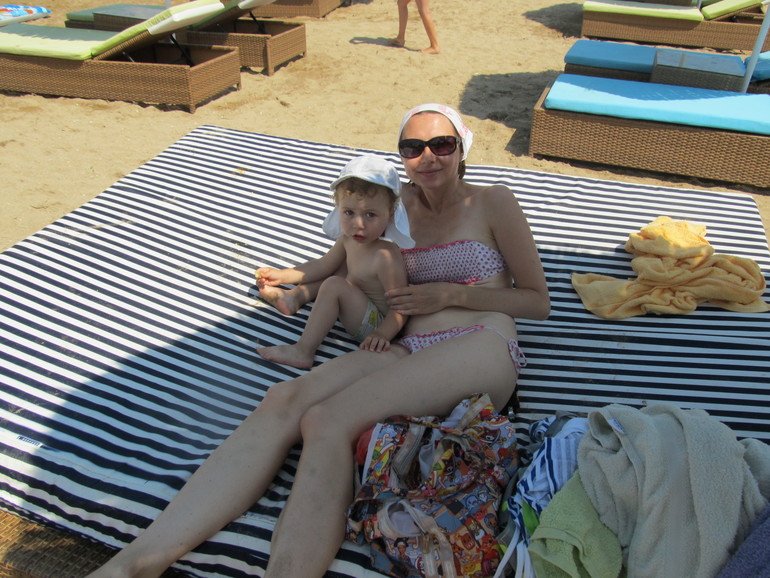 нас курортная жизнь идет полным ходом )) море, море и еще раз море! Макар кое как начал заходить в море, вчера аж по попу зашли и даже минутку в горизонтальном положении повозюкала по воде его ))) любит, чтобы я его подкидывала в воде , визжит, хохочет, но не забывает за шею держаться ))) очень не лит водоросли , прям орет дурниной, если не дай бог на него хоть мааахонькая водорослюшка прилепится )) но день на день не приходится - сегодня вообще в море не шел ни в какую, орал . только вечером на берегу ракушки кидал в воду.. наши друзья наконец то вернулись, сегодня к ним переехали ! у нас теперь большая компания ) правда как согласовать режимы всех детей непонятно ))вчера шиканули - пошли на вип-пляж , ну типа лежаки там большие, официанты, музычка, народу немного ..