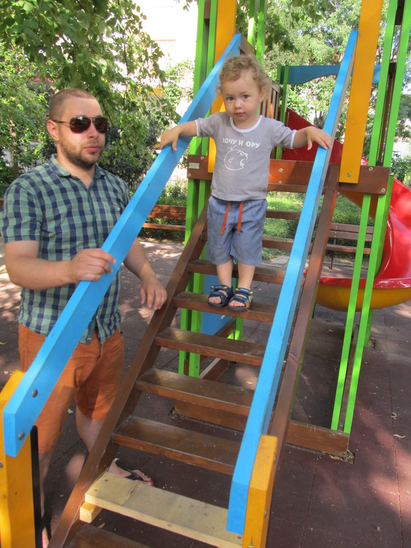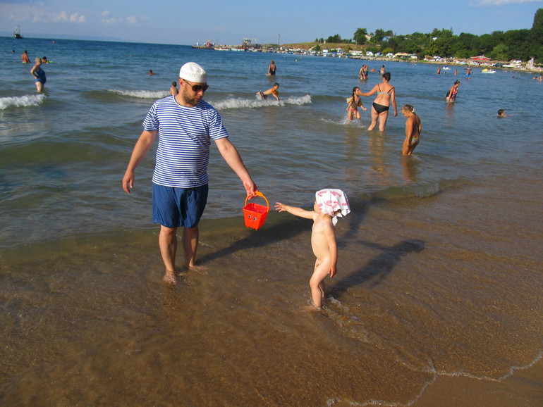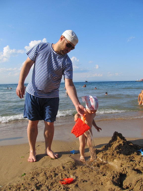 Макар привык к морю, шлепает там, топает, брызгается во всю. Но глубже чем по колено не заходит, боится. Дальше только на руках, вцепившись в шею. Всякие вольности в виде «поплавать» его или хотя бы просто «пополоскать» немедленно и категорически пресекаются трубным воем и судорожным закогтением за наши мягкие ткани, в том числе уши и волосы. А будучи на руках , даже разрешает попрыгать с ним в воде . очень нравится ему, если я или Толя шлепаются плашмя в воду (без него) . Тогда брызги во все стороны, Макарон ржет как конь на все побережье, как он умеет )) на берегу ковыряется в песке, строит с папой всякие тоннели, ямы, «замки», воду таскает ведрами в эти ямы-тоннели ))