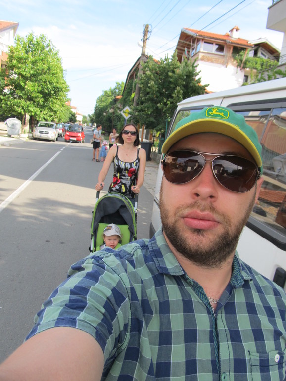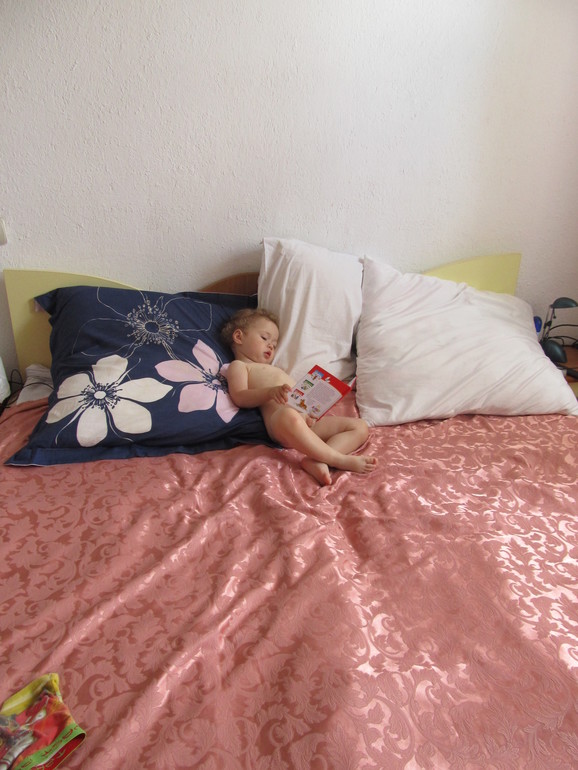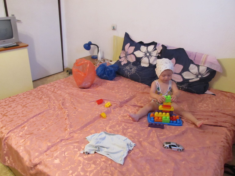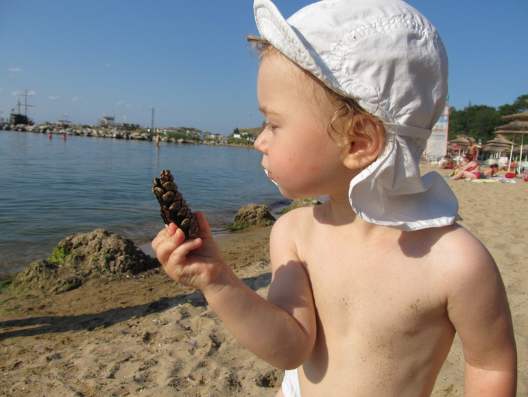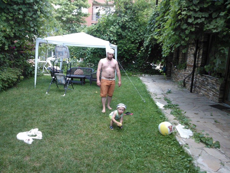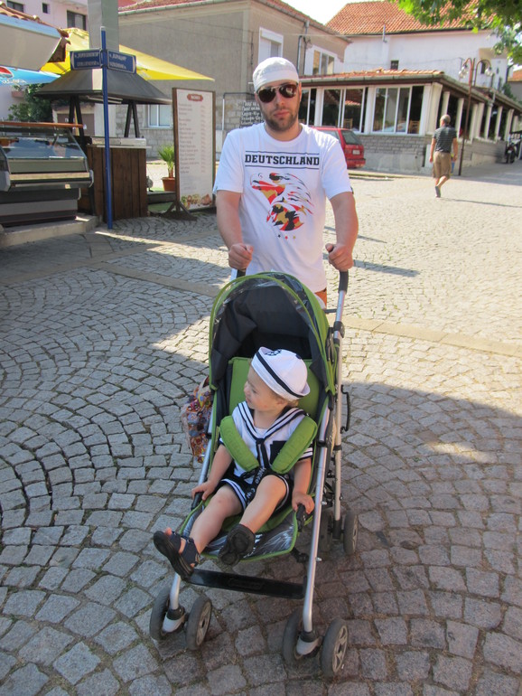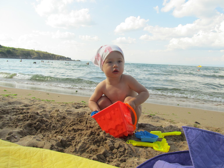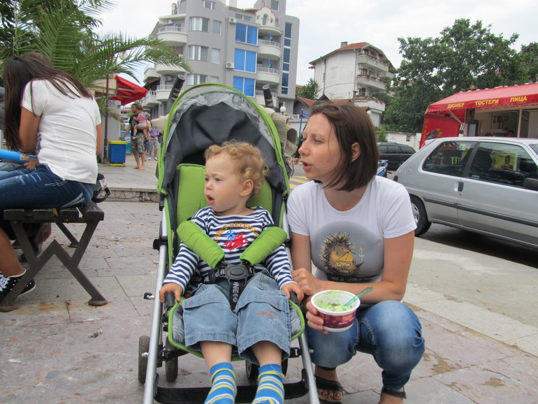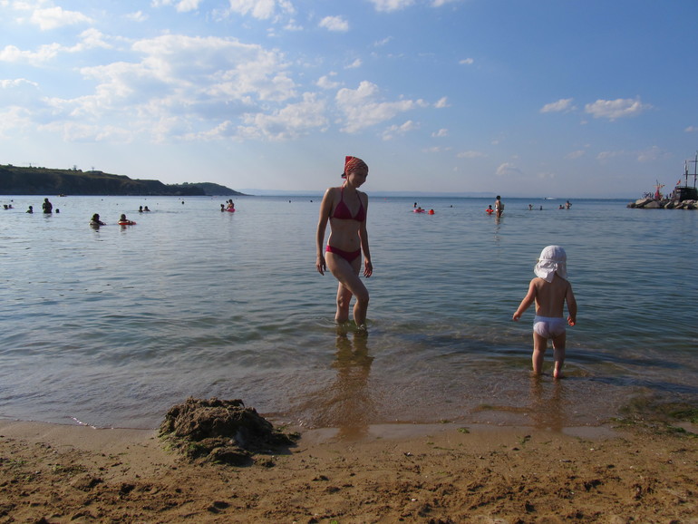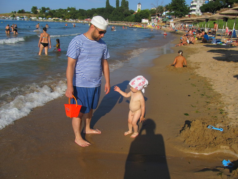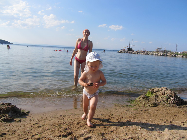 ну вот мы и в Болгарии ) два дня уже! долетели хорошо, задержек рейса не было (чего я боялась больше всего) , долетели хорошо, Макар вел себя неплохо , с учетом того, что встал он в три ночи, так как рейс был в 7 утра. взлет и посадку сосал, так что никаких неприятный ощущений у него не было, судя по всему. а посадку он вообще проспал, проснулся только уже в аэропорту. правда судя по всему он вообще не понял, что он летел в самолете )) единственный минус полета был - невероятно тесный салон, так тесно я еще никогда не летала, и жарко было почему то... макар вообще в памперсе и футболке летел. но за такие деньги - терпимо) ну в общем прилетели.. тут хорошо - теплынь, воооздух морской, моооре!!! )) зелень, фрукты , вкусная еда, все дешево. мы уже наелись рыбы , мидий - вкуснота невероятная! мидии сырые - 120 чтоль руб кг !!!! Макар опять ест как слон, даем ему рыбу, фрукты , некоторые простые блюда в кафе - все ест за обе щеки ) спит тоже пока хорошо. но очень много капризничает, надеюсь это от переизбытка эмоций и новых впечатлений ) мы живем в очень зеленой и милой домашней гостинничке.... номер простой, без изысков (но оно нам и не надо), зато балкон большой и все в зелени, виноград, сливы и что то еще мне неизвестное над головой прям. правда виноград еще неспелый( от моря правда неблизко - мин 20 топать, но ничего .. прогулки полезны )) море отличное - чистое, мелкое довольно долго, для детей хорошо, песок! Макара переполняют эмоции - с одной стороны ему очень нравится море, как только его видит , сразу кричит "ба-ба" (буль -буль = вода, море, рыбка и тд :))) ) и если мы не дай бог не сразу туда идем , орет как резанный и слезы крокодильи . с другой стороны в само море он идти не спешит, боится )) сегодня играл в песок на пляже, хочет чтобы ему в ведро воды набрали, сам идти боится. руку с ведром тянет в сторону моря - дай! )) на уговоры идти вместе не поддается ))) Ну хотя Толя его по морю поносил на руках все же, показывал рыбок, медузу высмотрели, отвлекается, забывает , что боится :)) потом вспоминает - тычет в сторону берега ) напрягает его столь обширное водное пространство пока)) пусть на берегу сидит, привыкнет, думаю, не вытащишь потом.