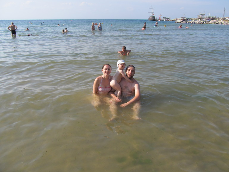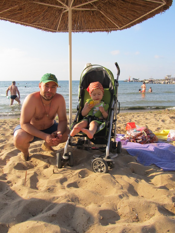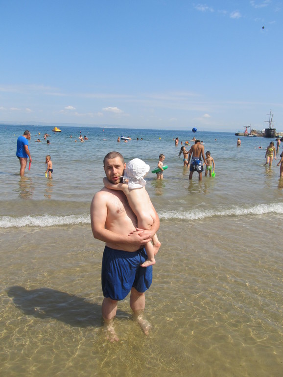 правда море он походу забыл за эти 4 дня .. опять не желает туда заходить, утром даже к берегу подходить не хотел.. и вообще лез в коляску и пристегивался - домой, мол ) вечером освоился малость.. затащила его таки в воду, вцепился в меня, как клещ )) потом отвлекся все же.. попрыгали с ним, поплескались, он забылся, даже сам на дно ногами встал , потом вспомнил, огляделся и опять на меня забрался-вцепился )) бояка мелкий )) а у меня все ноги в синяках , ибо он по мне топчется в море )