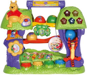 С этим ярким красочным развивающим центром для самых маленьких интересно играть и обучаться. В игрушке два режима: игровой и обучающий. Игрушка имеет множество активных элементов: кнопочки в виде горшочков с медом, кнопки с подсветкой, прыгающего Тигрулю, крутящийся цветок и качающиеся листья. При нажатии на любой из этих элементов раздаются различные звуки: забавные фразы, мелодии, одиночные звуки. Игрушка также произносит названия всех интерактивных элементов. С помощью этой функции ребенок выучит цвета и простые числа на английском языке. Кроме того, есть игровая функция: если опустить цветной шарик в отверстие в кроне дерева, то он скатится по желобку и по пути активирует различные активные элементы (звуковые эффекты и музыку).
