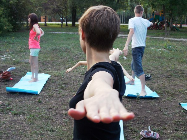 Первое упражнение. Исходное положение: стоя, расстояние между ступнями ног приблизительно 30 см, пальцы рук переплетены, ладонями вверх. Спина прямая, дыхание ровное свободное. Стоя прямо сделать наклон сначала влево, плавно не останавливаясь наклониться вправо. Таких наклонов проделать в обе стороны четыре раза, иначе сказать проделать поочерёдно 8 наклонов влево и вправо. В общем, это должно занять примерно 10 секунд.