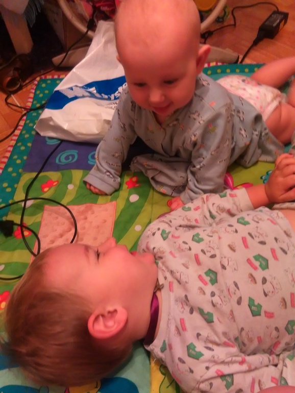 Вот вопрос, когда дети начинают играть вместе? Мои - уже давно занимают друг друга. Например, сегодня вечером: Дуня в стуле. Родион прыгает на нашей с мужем кровати, играет в "бабах"(это когда он на кровать падает). Дуняша смотрит и хохочет(а кому бы было не смешно?))) *я с тряпкой мою мебель*. Тут Дуняха роняет свою игрушку, и Родион подлетает за секунду, поднял и ей в руки сунул. И пошёл дальше делать "бабах")