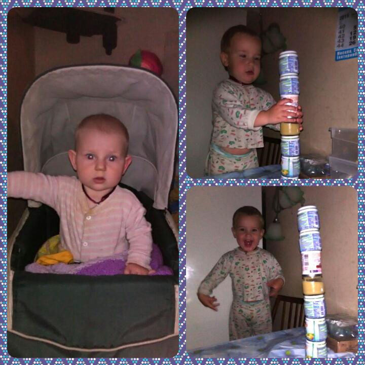 На фотке человек сидячий(проснулась и села в коляске) и строитель небоскребов из баночек с пюрешками( извиняюсь за пижамно-голопузый вид, дело было перед сном))