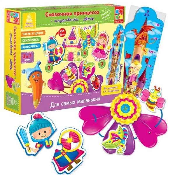 Комплектация: 14 деталей пазлов, 8 деталей для шнуровки, 1 ростомер, 2 шнурочки, 2 карточки, книжечка, правила.