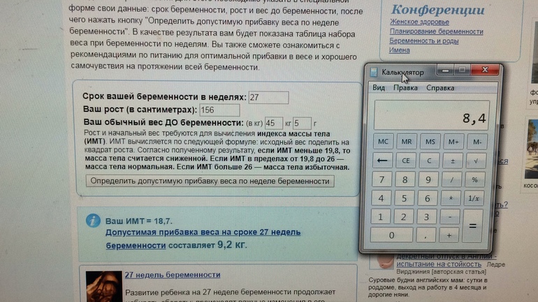 Я вот сегодня подумала, должны дел быть какие-то нормы прибавки веса, которые можно высчитать. Нашла! Посчитала! И я рада :) хоть гинекологичка моя и раздражает меня своими причитаниями про большой набор! У меня 8,2 кг прибавка, а можно 9,4кг))