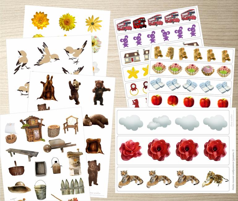 Два листа с вариантами выбора из трёх одинаковых картинок (но для начинающих можно использовать по две)