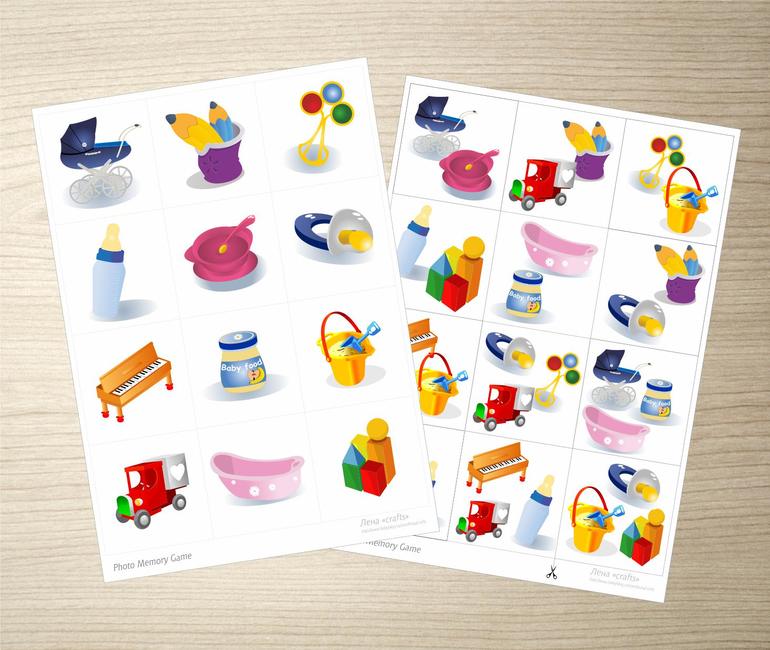 Найди пару - для внимания. Здесь понадобятся карточки в двух экземплярах. Один лист разрезаем и предлагаем ребёнку подобрать пару.