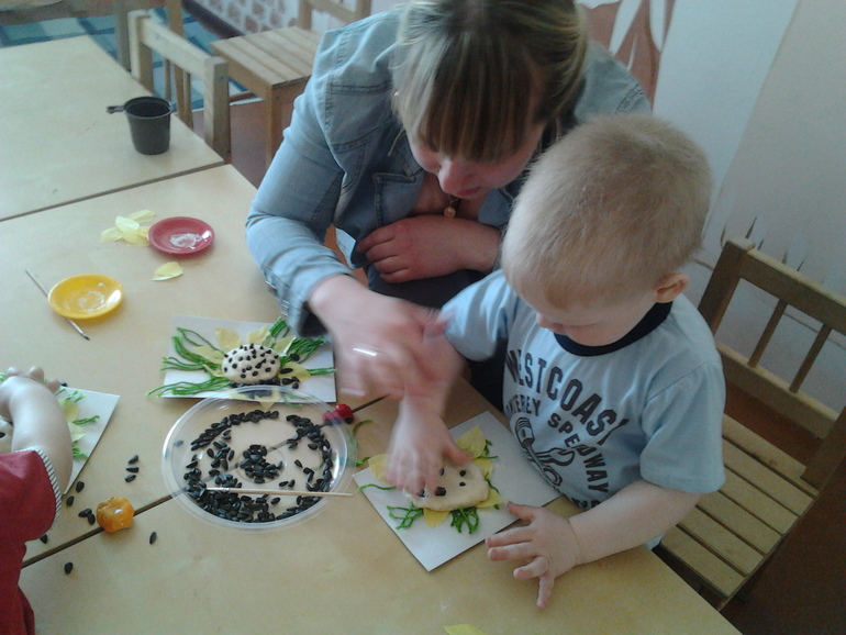 Творчество. Делать аппликации из ваты, бумаги, крупы, бусинок, бумажных тарелочек; лепить из теста и пластилина; научить обращаться с клеем. Использовать разные материалы: луковую шелуху, зубочистки, гофрированную бумагу, пшено, макароны, горох, крышки от бутылок и банок.