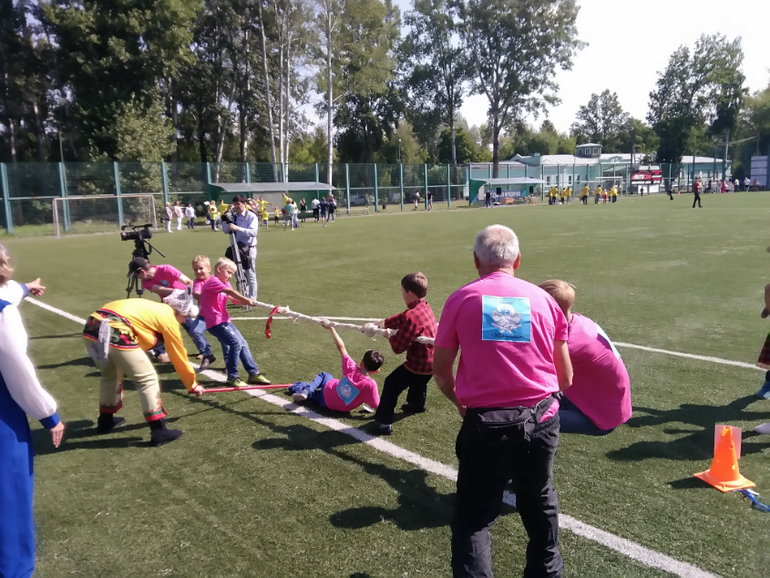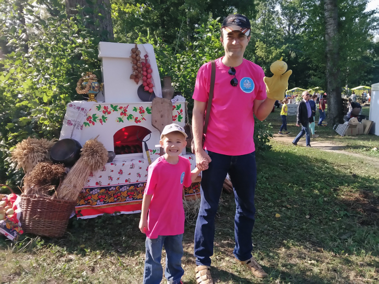 Ох, какая же погодка выдалась чудная в этот день! Небо синее-синее, трава зеленая-зеленая, солнце теплое-теплое! +26 и ветерок легкий обдувает. Пришли к стадиону, а там уже толпа семей, повсюду герои русских сказок ходят, неожиданно с загадками на всех наскакивают. Телега посреди поляны стоит, яблок полная, подходи, бери сколько хочешь. Прилавки красочные с медом, орехами, другой снедью и чудесами разными. А между всем этим великолепием бегают как сайгаки воспитатели и орут:
