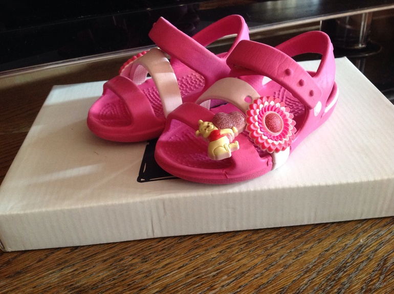 Пляжные сандалики Кроксы оригинал. Бу на море. Очень удобные, невесомые. С украшением джибитсом Винни Пух. По стельке 12,5-13 см.- с5