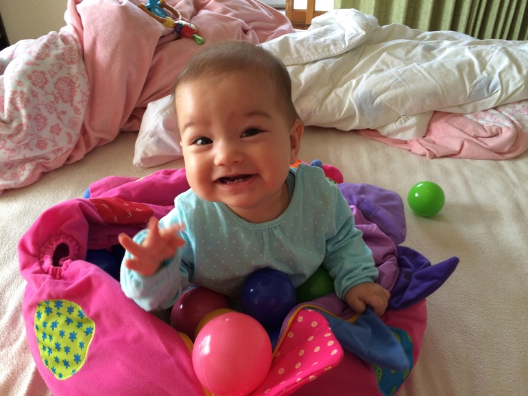 Любимое занятие: вытащить и облизать все игрушки из небольшой корзины! Сидя на полу это развлечение хорошо может занять дочу. Как только корзина пуста- интерес пропадает, потому кто-нибудь из нас кто хочет тишины опять приходит на помощь.
